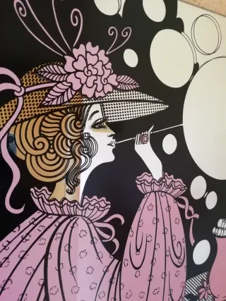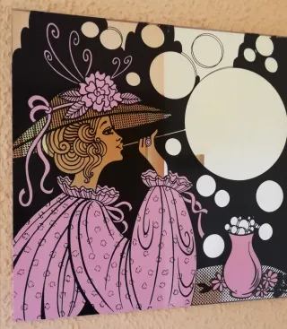 Este espejo presenta un diseño llamativo con una figura femenina y detalles artísticos. - Marco con silueta en rosa y negro. - Elementos decorativos circulares. - Figura de mujer con sombrero y vestido. Los tonos marrones que se ven son el reflejo de la puerta. Medida 30x20 cm.