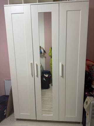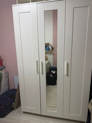 Armario de tres puertas con acabado en blanco y detalles de espejo. - Puertas con tiradores. - Acabado en madera y cristal. POSIBILIDAD DE ENTREGARLO DESMONTADO
