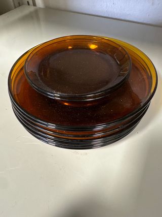 Conjunto de 7 platos grandes y dos pequeños Duralex en color ámbar. - Fabricados en cristal resistente. - Diseño clásico y elegante.