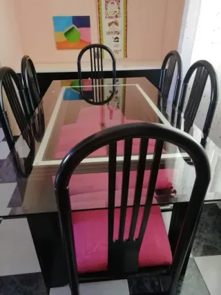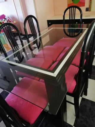 Conjunto de mesa de comedor con seis sillas lacado en negro y blanco. - Mesa con superficie de cristal. - Sillas con asientos en color fucsia. - Estructura de las sillas en color negro. Con roces lógicos del uso. Medida 1,70x0,90x0,74 cm.