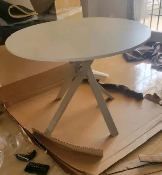 Mesa redonda de cocina. - Tablero blanco de 105 cm de diámetro - Patas de la mesa de metal beige -Sillas blancas con las patas de madera