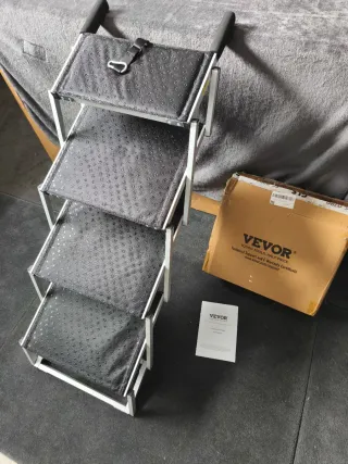 Escalera plegable de cuatro peldaños, diseñada para ayudar a tu perro a subir y bajar del coche de forma segura y cómoda. Es fácil de transportar y almacenar. - Estructura de aluminio resistente. - Superficie antideslizante en cada peldaño. - Diseño plegable para un fácil almacenamiento. - Incluye correa de seguridad. NEGOCIABLE