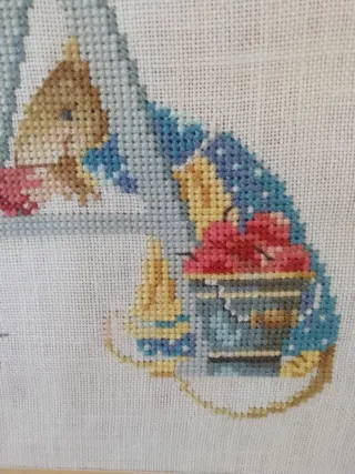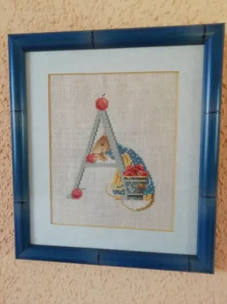 Precioso cuadro decorativo con la letra A bordada a punto de cruz. Ideal para añadir un toque personal a cualquier rincón. - Diseño con la letra A. - Incluye detalles de manzanas rojas y ratita. - Marco de madera azul. Medida aproximada 26 cm de alto x 23,50 cm de ancho.