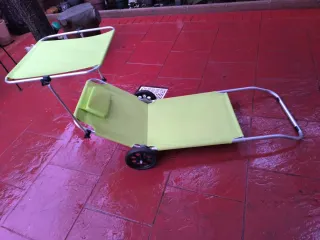 Tumbona con ruedas y parasol, ideal para la playa o piscina. Se puede regular la inclinación para mayor comodidad. Se convierte en carro para transportar cosas en playa, etc. - Estructura de aluminio. - Asiento y respaldo de tela. - Ruedas para facilitar el transporte. - Parasol integrado.