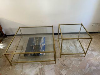 Elegante conjunto de dos mesas de centro con estructura metálica dorada y sobre de cristal. - Diseño moderno y versátil. - Ideal para complementar tu salón. La mesa mediana tiene una parte del vidrio rota. Se regala otra mesa adicional auxiliar, con ruedas, tamaño pequeño.