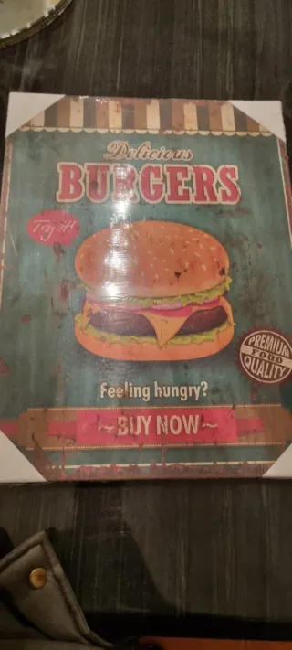 Este cuadro decorativo con un diseño retro de hamburguesas es perfecto para darle un toque especial a tu cocina o comedor. - Diseño vintage Delicious Burgers. - Imagen de una hamburguesa apetitosa. - Frase Feeling hungry? BUY NOW. - Detalle Premium Food Quality.