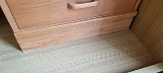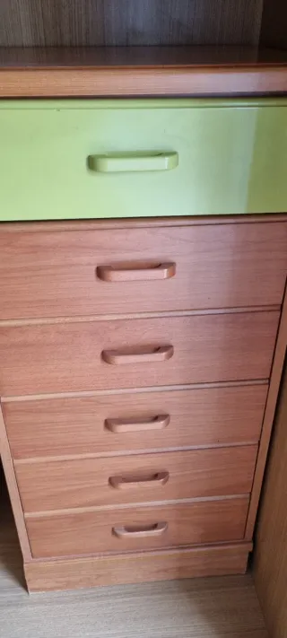 Mueble de almacenaje con varios cajones. Combina un cajón superior de color verde con varios cajones inferiores de madera. - Cajón superior de plástico. - Cajones inferiores de madera.