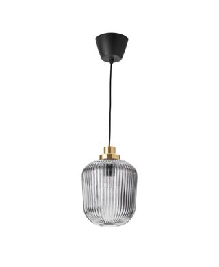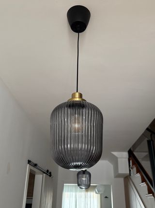 Elegante lámpara de techo de Ikea con un diseño moderno y sofisticado. - Pantalla de cristal acanalado. - Detalles metálicos en acabado dorado. - Cable de suspensión negro. 3 unidades. 15€ cada una