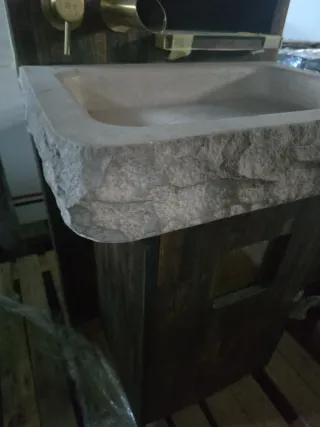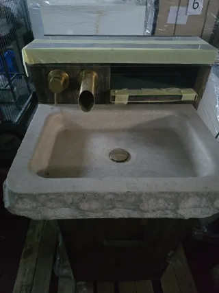 Conjunto de mueble para lavabo con acabados de calidad. - Encimera de piedra. - Estructura de madera. - Grifería y desagüe en metal dorado.