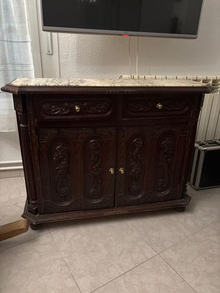 Elegante mueble de madera con una preciosa encimera de mármol. - Diseño clásico con detalles tallados. - Dos puertas frontales con tiradores dorados. - Dos cajones superiores con tiradores dorados. Precio algo negociable