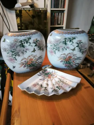 Precioso conjunto decorativo japonés de porcelana de la marca Kyoto Shibata (mirar ultimas fotos). Las flores principales representadas en el jarrón son crisantemos (conocidos como kiku en japonés). El crisantemo es una de las flores más emblemáticas de la cultura japonesa y posee un profundo significado, es el emblema de la familia imperial de Japón y aparece en el sello oficial del país. Representa la longevidad, el rejuvenecimiento y el otoño. Además están acompañados por mariposas, que simbolizan la metamorfosis y la alegría.