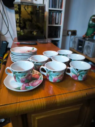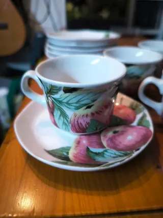 Precioso juego de tazas de té sin rotos ni nada con sus platos a juego, decoradas con un diseño de frutas de la marca española Pontesa. - Incluye 8 tazas. - Incluye 8 platos. - Diseño de manzanas y hojas.