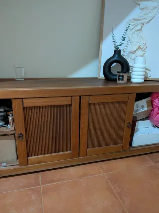 Mueble de televisión de madera con un diseño elegante y funcional. - Puertas correderas. - Estantes interiores para almacenamiento. - Acabado en tonos marrones