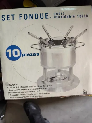 Set de fondue completo de acero inoxidable 18/10. - Incluye olla de 16 x 9.5cm con asas y 0.6mm de espesor. - Tapa con soporte para pinchos. - Base para fondue. - Quemador con dos posiciones. - 6 tenedores para fondue.