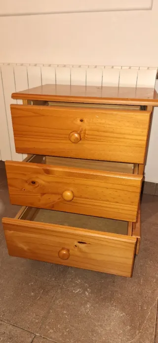 Mesita de noche de madera con tres cajones. Tiene unos detalles de gastado detrás que no me habia dado cuenta hasta que la puse a vender! - Cajones con tiradores redondos. - Diseño clásico y funcional. - 34cm x 47cm x 60 cm