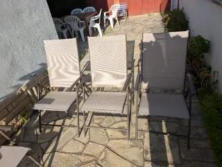 Conjunto de 6 sillas de jardín apilables. Son ideales para espacios exteriores y fáciles de almacenar. EXCELENTE CALIDAD, SUTILMENTE PESADAS. Muy buen estado, poco uso. - Diseño apilable para ahorrar espacio. - Fabricadas en plástico resistente. - El precio nuevo de compra fue de 20 euros cada una.