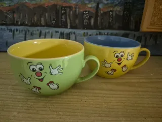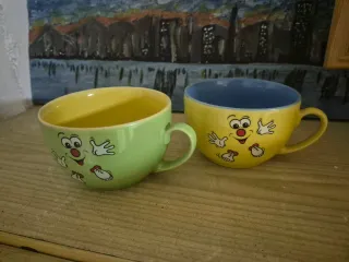 Set de dos tazones con un diseño alegre y original, perfectos para el desayuno o la merienda. Cada uno presenta una cara sonriente con detalles llamativos. - Tazón verde con interior amarillo. - Tazón amarillo con interior azul. - Diseño de caras animadas.