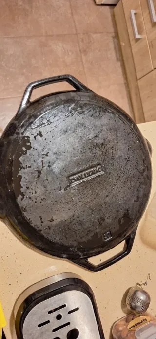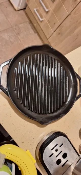 Sartén de hierro fundido con diseño de parrilla. Apto para todo fuego. Como nueva, aparece mojada en la foto porque la acabo de lavar! - Marca Curil Lignac Lignac - Superficie con estrías para marcar alimentos. - Asas integradas para un mejor agarre. - 32 cm de diámetro. - Funciona en todos los fuegos, inducción incluido.