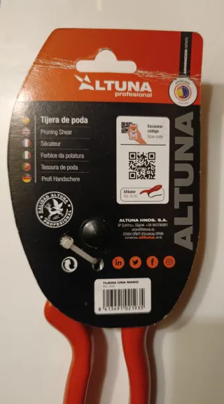 Tijeras de podar de la marca ALTUNA, modelo Profesional. - Mango ergonómico de color naranja y blanco. - Cuchillas de acero. - Cierre de seguridad.