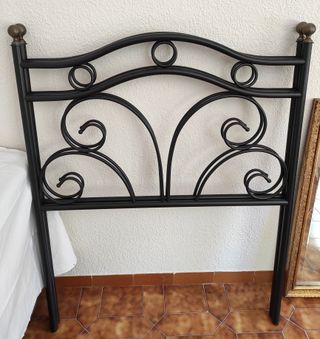 Elegante cabezal de forja con un diseño clásico y detalles cromados. Cabezal para cama individual de forja negro con bola cromada. 100cm ancho x 125-130 cm de alto máx. Tengo 2. Son nuevos y fabricados en España. cada uno costó 149€. precio la unidad, vendo por separado. Los 2 x 175€ Ancho:100 cm Fondo:10 cm Alto:130 cm - Fabricado en metal resistente. - Acabado en color negro con adornos dorados.