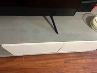 Mueble de televisión con un diseño moderno y funcional, combinando acabados en blanco y madera. - Amplio espacio de almacenamiento. - Diseño elegante y minimalista. *No incluye luces led ni las laminas de palilleria de la pared de fondo.
