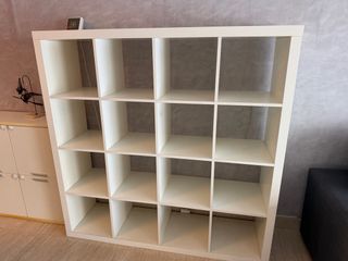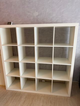 Estantería modular de madera en color blanco. Ideal para organizar tus libros, objetos decorativos o cualquier cosa que necesites tener a mano. - Diseño de cubos. - Amplio espacio de almacenamiento. • Ancho: 147 cm • Alto: 147 cm • Fondo: 39 cm • Medida interior de cada cubo: aprox. 33 × 33 cm