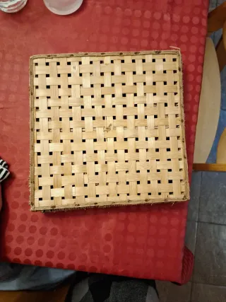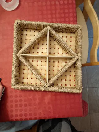 Cesta decorativa con un diseño tejido y un borde reforzado y madera. Hecho a mano - Elaborada con materiales naturales. - Forma cuadrada con divisiones internas. - 25 cm x 25cm
