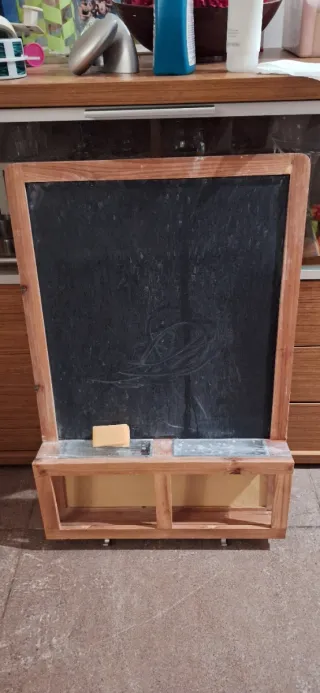 Pizarra con marco de madera y base para tiza. - Superficie de escritura negra. - Marco de madera. - 48 cm x 70 cm