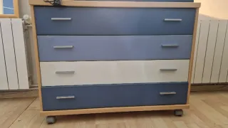 Cajonera juvenil con un diseño moderno y funcional. Ideal para organizar ropa y objetos personales. - Estructura de madera con frentes de cajón en diferentes tonos de azul y blanco. - Tiradores metálicos para facilitar la apertura. - Ruedas para moverla fácilmente. Armario esquinero a juego en otra oferta