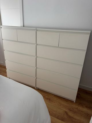 2 cómodas de madera de Ikea en color blanco. Cuenta con varios cajones para almacenamiento. Sobre de cristal. - Diseño moderno y funcional. - Acabado liso y fácil de limpiar. Se venden juntas o por separado. Precio por unidad.