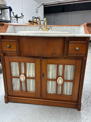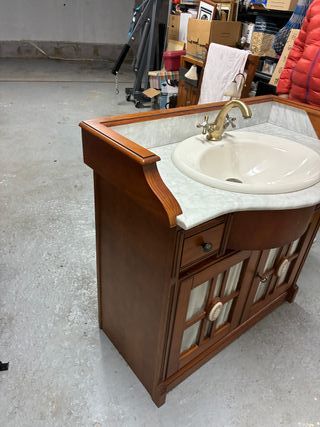 Mueble de baño con un diseño clásico y elegante. - Encimera de mármol. - Estructura principal de madera. - Detalles en dorado.
