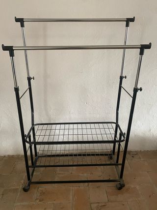 Este perchero doble es una solución práctica para organizar tu ropa. Cuenta con dos barras para colgar prendas y estantes inferiores para almacenamiento adicional. - Estructura metálica y detalles en plástico. - Barras de colgar de acero inoxidable. - Ruedas para facilitar su movilidad.