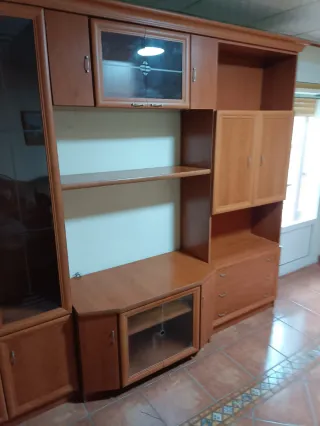 Mueble para televisión con un diseño moderno y funcional. - Estructura principal de madera. - Puertas de cristal para almacenamiento. - Ruedas para fácil movilidad. - Plataforma giratoria. Estan en Segur de Calafell, en un tercer piso con ascensor. Precio negociable. Urge vender. Tengo muchos productos en mi perfil, crea un lote y te hago un descuento.