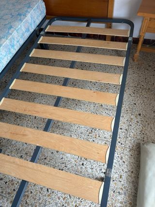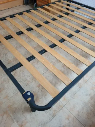 Somier de lamas de madera con estructura metálica. - Medidas: 135x185 cm. - Lamas de madera. Incluye las 4 patas metálicas. Una de las lamas está un poco quebrada por la parte de abajo.