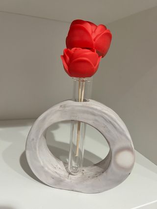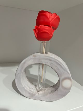 Original jarrón decorativo con un diseño moderno y llamativo. Perfecto para añadir un toque de color a tu hogar. - Material: Resina - Color base: Gris - Incluye dos flores rojas decorativas