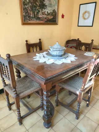Conjunto de mesa y seis sillas antiguas con un diseño clásico y elegante. - Estructura de madera maciza. Roble americano - Asientos de tela. - Detalles tallados en la madera. A recoger en Cardona ( BCN )