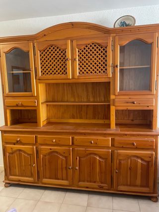 Mueble de comedor de madera con un diseño clásico y elegante. Ideal para almacenar y exhibir tus objetos. - Estructura de madera maciza de pino - Puertas con detalles de celosía. - Compartimentos acristalados. - Cajones y armarios amplios.