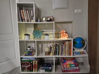 Estantería blanca con varios compartimentos, ideal para organizar libros y objetos decorativos. Incluye algunos libros y elementos decorativos. - Estantería de madera y cristal. - Libros de tapa dura y blanda. - Decoración variada.