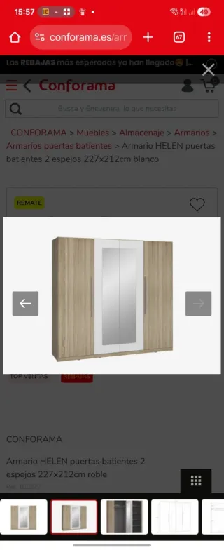 Armario de puertas batientes HELEN con dos espejos. Sus dimensiones son 227x212cm. - Acabado en roble. - Diseño moderno con espejos centrales.