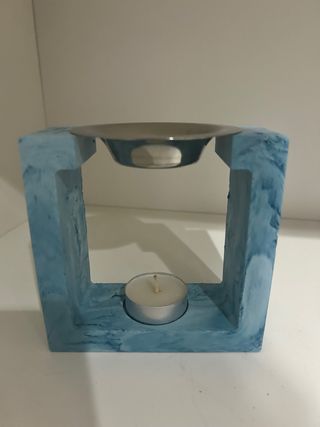 Quemador de resina para wax melt con un diseño moderno y elegante. Ideal para crear un ambiente agradable en tu hogar. - Base de piedra con detalles veteados en azul. - Recipiente superior de metal plateado.