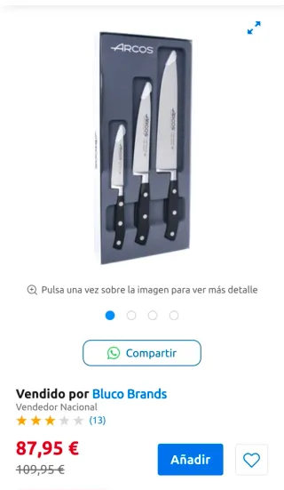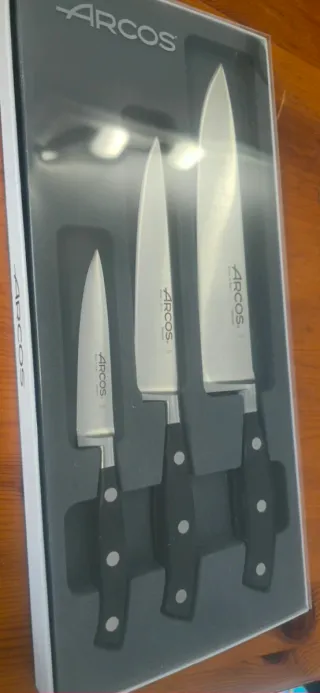 Set de cuchillos de cocina de la serie Arcos. - Incluye tres cuchillos de diferentes tamaños. - Mangos ergonómicos negros.