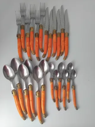 Conjunto de cubiertos Laguiole para seis personas. Acero inoxidable con los mangos de color naranja y las virolas doradas. El set incluye 24 piezas: 6 cuchillos, 6 tenedores, 6 cucharas y 6 cucharillas de postre. Mangos curvos y mosca o abeja decorativa.