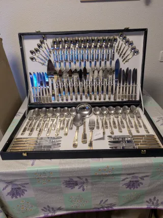 Elegante cubertería italiana de acero inoxidable 18/10, ideal para cualquier ocasión. - Set completo de cubiertos. - Diseño clásico y duradero. -En estuche azul aterciopelado -Sin estrenar. - con certificado