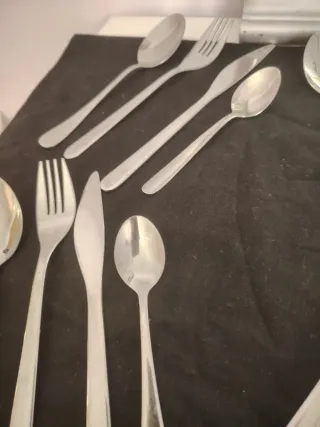 Conjunto de cubiertos de acero inoxidable - Incluye cucharas, tenedores y cuchillos. - Diseño elegante y duradero. 6 cuchillos 6 tenedores 6 cucharas. 1 tenedor y una cuchara son diferentes, pero casi iguales el modelo