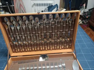 Elegante cubertería de 12 servicios presentada en un estuche de madera.cubiertos de acero inoxidable. - Incluye cubiertos para 12 personas. - Diseño clásico con detalles. - Materiales de calidad.nunca se estreno, ajuar clásico pagado con mucho esfuerzo