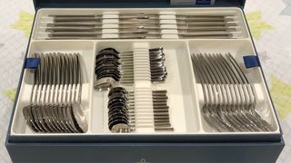 Elegante cubertería completa en un maletín. - Juego de cubiertos de alta calidad. - Diseño clásico y duradero. - Incluye cucharas, tenedores y cuchillos.