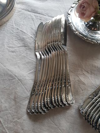 Cuberteria de la prestigiosa marca francesa Christofle para 12 comensales, modelo Marly (12 cucharas, 12 tenedores de mesa y 12 cuchillos de mesa - 12 tenedores de postre y 12 cucharillas de postre - 1 pieza de servir). Los cubiertos, están marcados, cada uno, por dos contrastes, el del "maestro" con emblema y en el que aparece Christofle. La firma representa las cuberterías y platería del patrimonio de las artes decorativas francesas desde el s. XIX. El precio original es de 5400 euros. Es un modelo que la casa Christofle aun comercializa, se puede contrastar en su web. Solo los doce cuchillos valen eso.