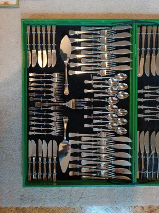Elegante cubertería de 12 servicios presentada en un estuche de madera.cubiertos de acero inoxidable. - Incluye cubiertos para 12 personas. - Diseño clásico con detalles. - Materiales de calidad.nunca se estreno, ajuar clásico pagado con mucho esfuerzo
