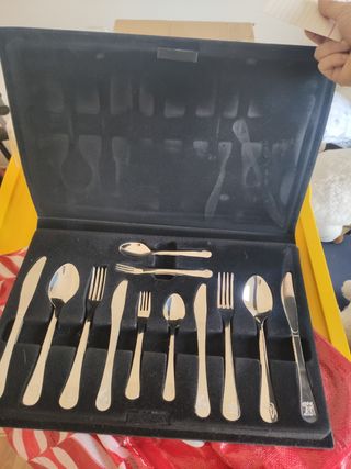 Elegante cubertería Dalia con un diseño clásico. - Juego completo de cubiertos. - Acabado plateado brillante. - Fabricada en metal de alta calidad. La caja está rota pero los cubiertos sin estrenar