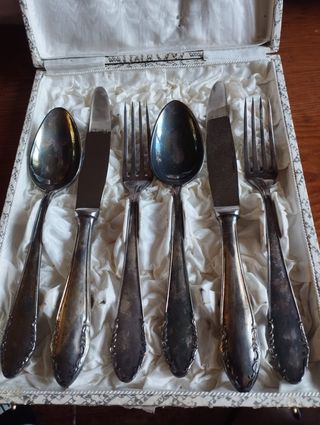 Conjunto de 2 juegos de cubiertos de la casa española Meneses de los años 50,cada uno en su caja ,unos llevan las iniciales GA y los otros GO. Probablemente sean de alpaca plateada.En buen estado, vendidos en la joyería Fervic de Huelma en Jaén.Se pueden recoger en mano en Jaén capital Antigüedades Rivera,